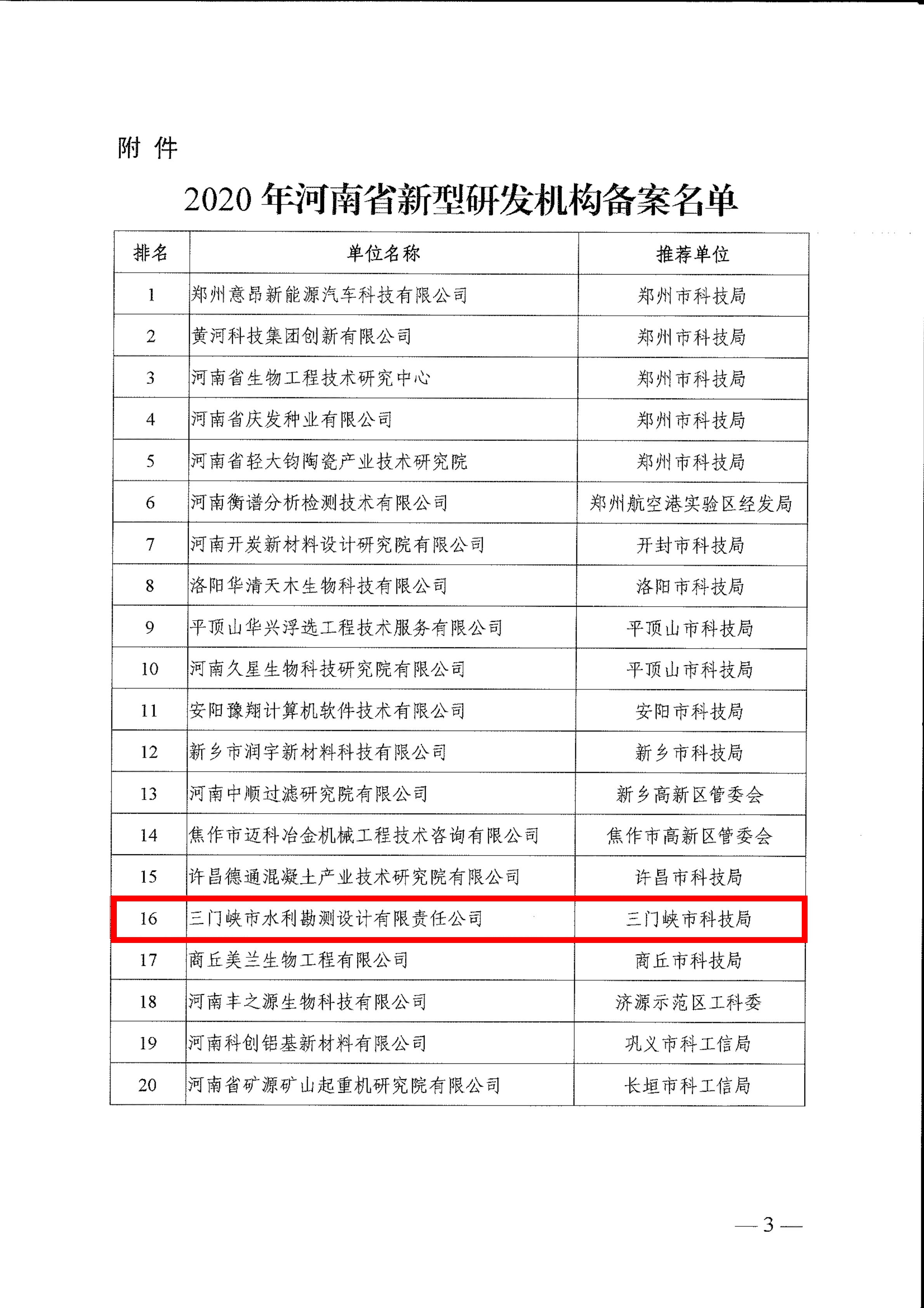 根據(jù) 《關(guān)于開展2020年省新型研發(fā)機(jī)構(gòu)備案登記工作的通知》(豫科成〔2020〕4號)精神。為深入實施創(chuàng)新驅(qū)動發(fā)展戰(zhàn)略,加快推進(jìn)河南省創(chuàng)新引領(lǐng)型機(jī)構(gòu)建設(shè),河南省科技廳組織開展了2020年省新型研發(fā)機(jī)構(gòu)備案工作。三門峽市水利勘測設(shè)計有限責(zé)任公司申報2020年河南省新型研發(fā)機(jī)構(gòu)成功獲批。