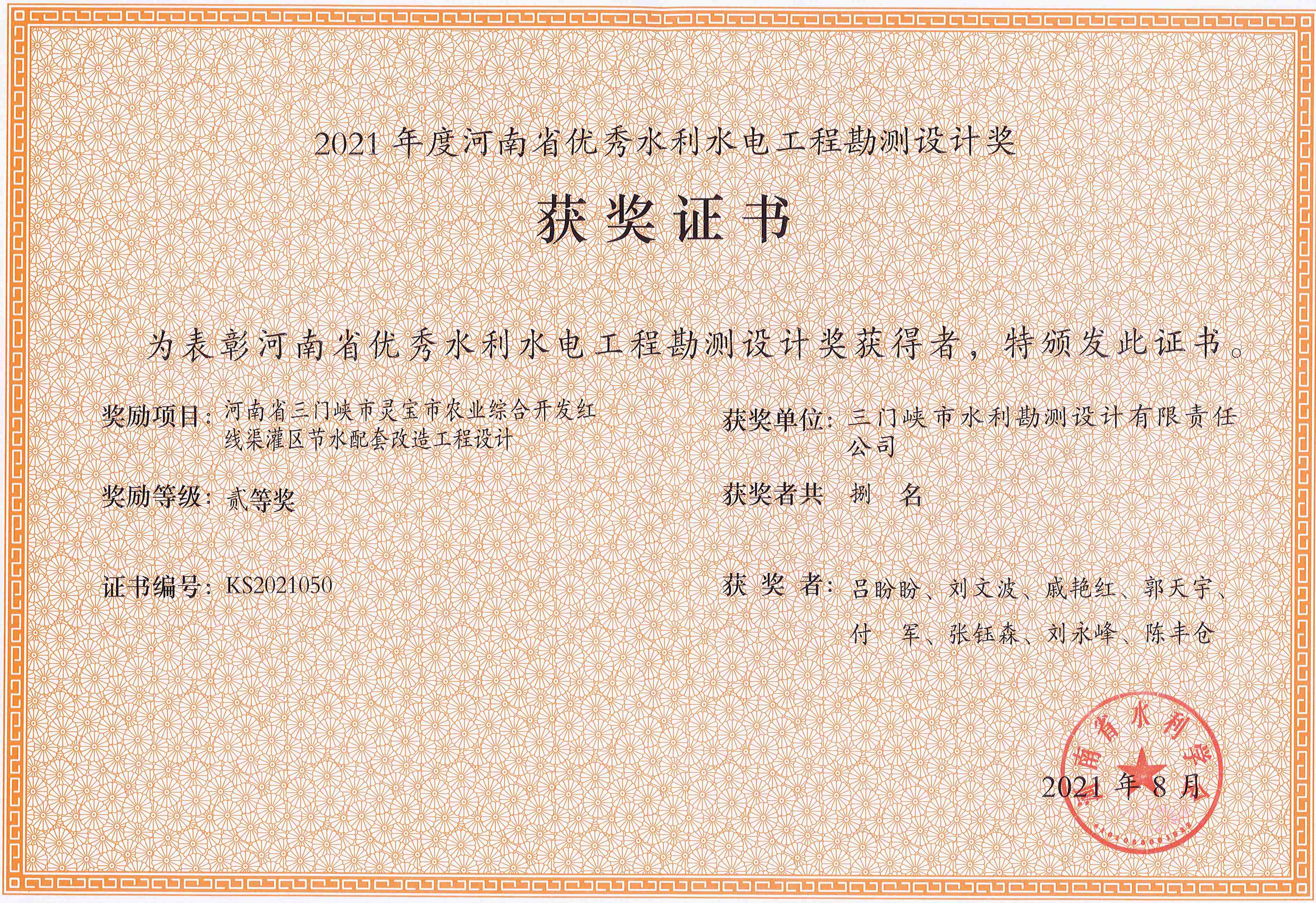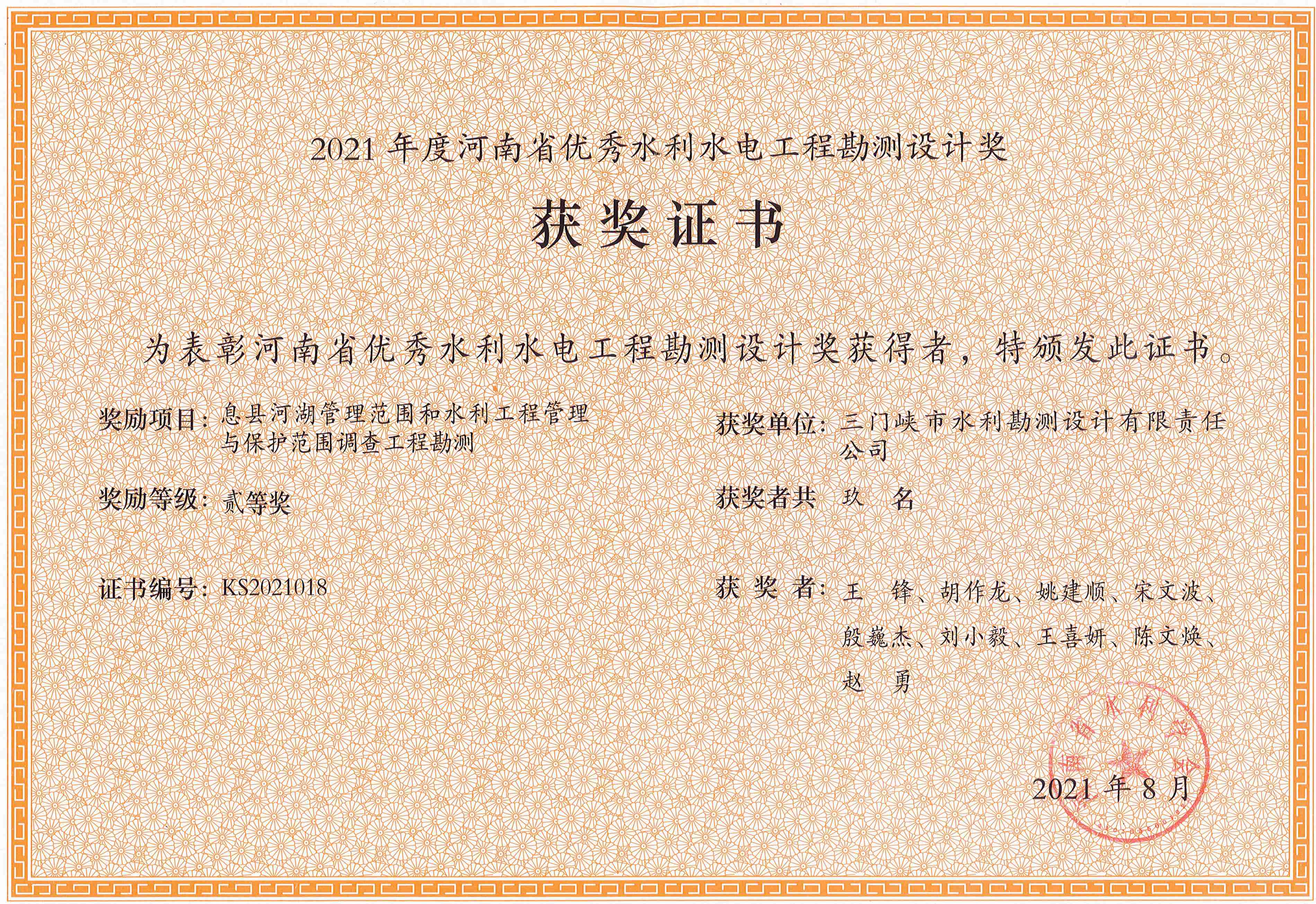 近日,由我公司承擔(dān)完成的五個項目分別獲2021年度河南省優(yōu)秀水利水電工程勘測設(shè)計獎一等獎和二等獎。其中,獲一等獎的項目有《三門峽市天鵝湖防洪改造提升工程可行性研究》、《河南省信陽市息縣澺河(樁號0+00-15+920段)治理工程設(shè)計)》;二等獎的項目有《河南省三門峽市靈寶市農(nóng)業(yè)綜合開發(fā)紅線渠灌區(qū)節(jié)水配套改造工程設(shè)計》、《息縣河湖管理范圍和水利工程管理與保護范圍調(diào)查工程勘測》和《新河灃西新城段河道管理范圍劃界勘測》。