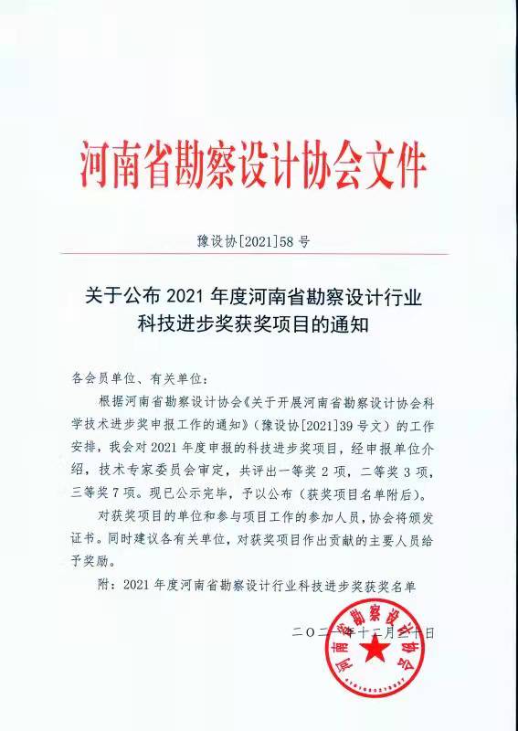 河南省勘察設(shè)計協(xié)會近日組織召開了“2021年度河南省勘察設(shè)計行業(yè)科技進(jìn)步獎評會”經(jīng)技術(shù)專家委員會審定,我公司科研項目《遠(yuǎn)程智能水情監(jiān)測系統(tǒng)》獲三等獎。