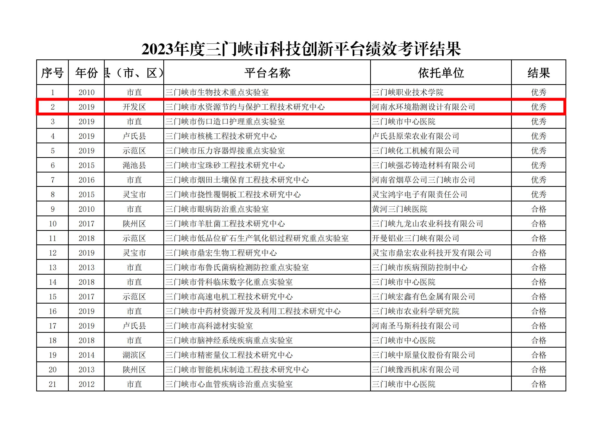 9月22日,三門峽市科學(xué)技術(shù)局發(fā)布了2023年度三門峽市科技創(chuàng)新平臺績效考評結(jié)果名單,此次全市共有一百余家平臺參與考評,8家平臺績效考評優(yōu)秀,我公司的三門峽市水資源節(jié)約與保護(hù)工程技術(shù)研究中心位列其中!