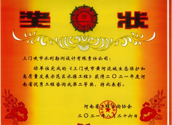 三門峽市黃河流域生態(tài)保護(hù)和高質(zhì)量發(fā)展示范區(qū)水源工程2021年度優(yōu)秀工程咨詢成果二等獎(jiǎng)