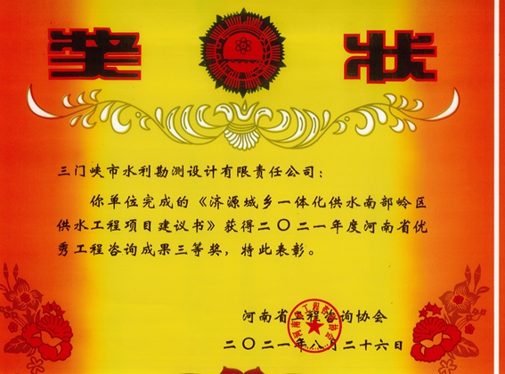 濟(jì)源城鄉(xiāng)一體化供水面部領(lǐng)區(qū)供水工程項(xiàng)目建議書2021年度河南省優(yōu)秀工程咨詢成果三等獎(jiǎng).