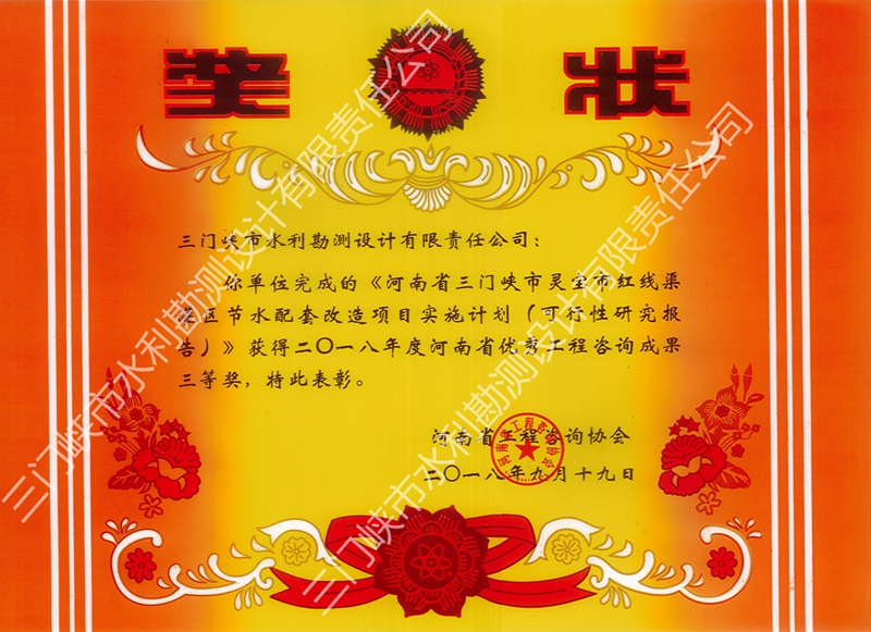 我公司于2017年編制完成的《河南省三門峽市靈寶市紅線渠灌區(qū)節(jié)水配套改造項(xiàng)目實(shí)施計(jì)劃》(可行性研究報(bào)告)、《潢川縣水土保持規(guī)劃(2016-2030)》受到業(yè)主好評(píng),并獲得河南省工程咨詢協(xié)會(huì)頒發(fā)的“2018年度河南省優(yōu)秀工程咨詢成果獎(jiǎng)”。