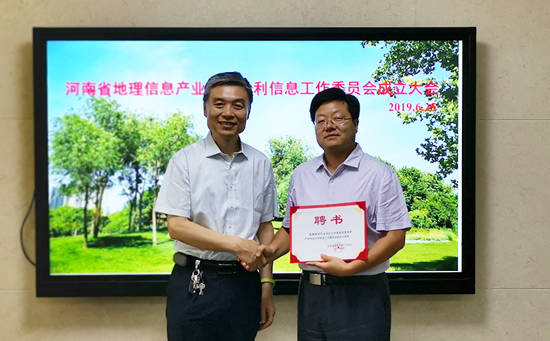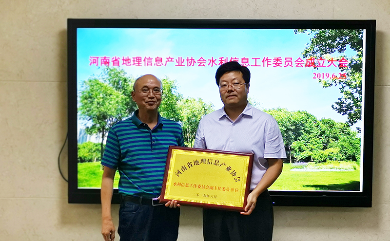 河南省地理信息產(chǎn)業(yè)協(xié)會(huì)鄧月明會(huì)長為我公司頒發(fā)副主任委員單位標(biāo)牌