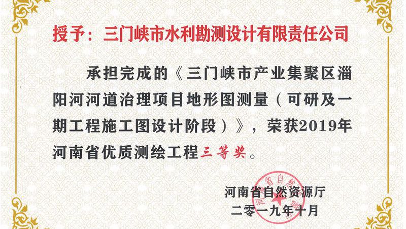 近日,由我公司承擔(dān)完成的《三門(mén)峽市產(chǎn)業(yè)集聚區(qū)淄陽(yáng)河河道治理項(xiàng)目地形圖測(cè)量(可研及一期工程施工圖設(shè)計(jì)階段)》獲2019年河南省優(yōu)質(zhì)測(cè)繪工程三等獎(jiǎng)。