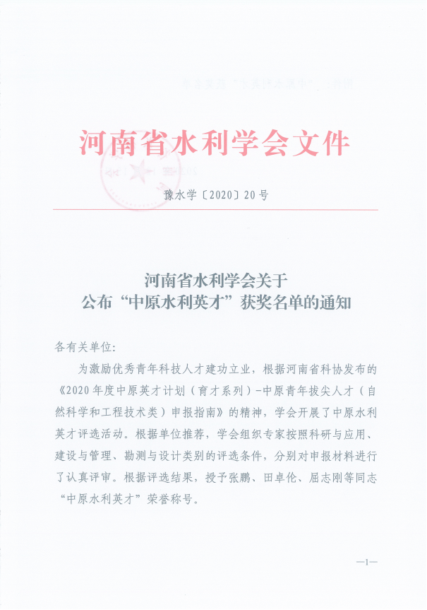 近日,河南省水利學(xué)會公布了“中原水利英才”獲獎名單,我司趙宗銳同志榮獲“中原水利英才”榮譽稱號。