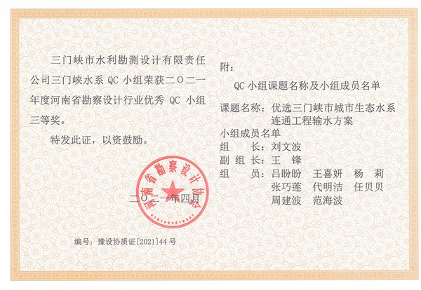 近日,我公司申報(bào)課題《優(yōu)選三門峽市城市生態(tài)水系連通工程輸水方案》榮獲2021年度河南省勘察設(shè)計(jì)行業(yè)優(yōu)秀QC小組三等獎(jiǎng)。
