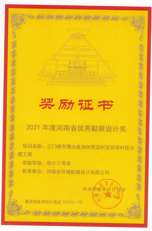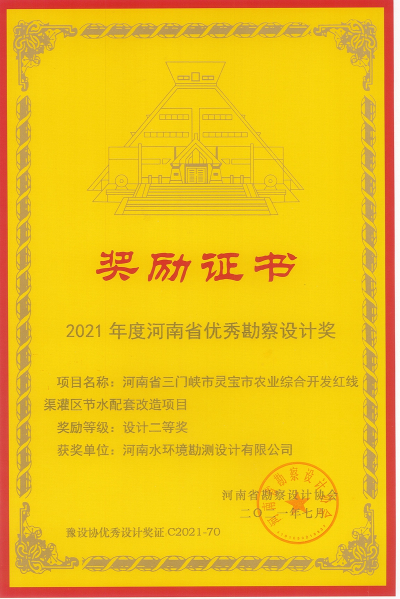 近日,由我公司承擔完成的《河南省三門峽市靈寶市農業(yè)綜合開發(fā)紅線渠灌區(qū)節(jié)水配套改造項目》和《三門峽市澠池縣澗河塔泥村至蘇灣村段治理工程》獲2021年度河南省優(yōu)秀勘察設計獎。