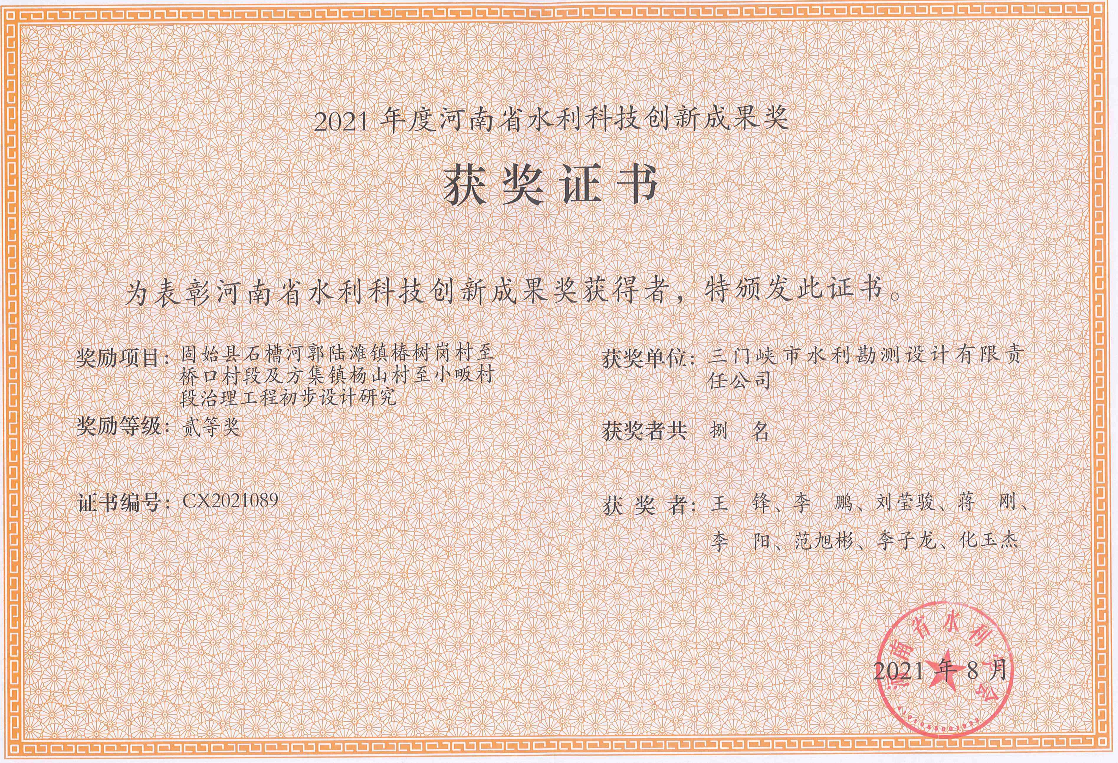 2021年8月,由我公司承擔完成的《吉縣腰西水庫初步設計階段工程地質勘察研究》、《三門峽市城市生態(tài)水系連通工程可行性研究》和《固始縣石槽河郭陸灘鎮(zhèn)椿樹崗村至橋口村段及方集鎮(zhèn)楊山村至小畈村段治理工程初步設計研究》分別獲2021年度河南省水利科技創(chuàng)新成果一等獎和二等獎。