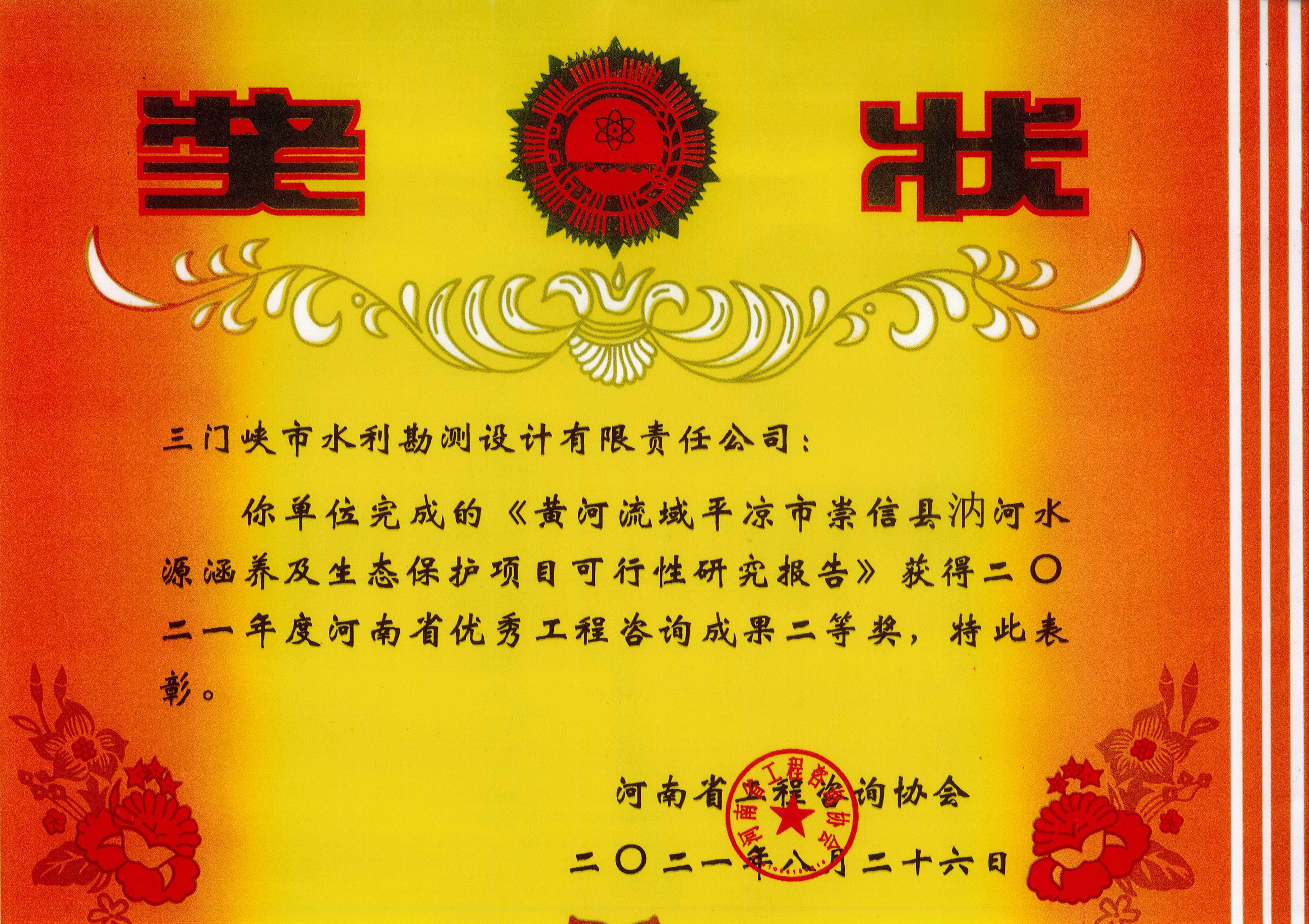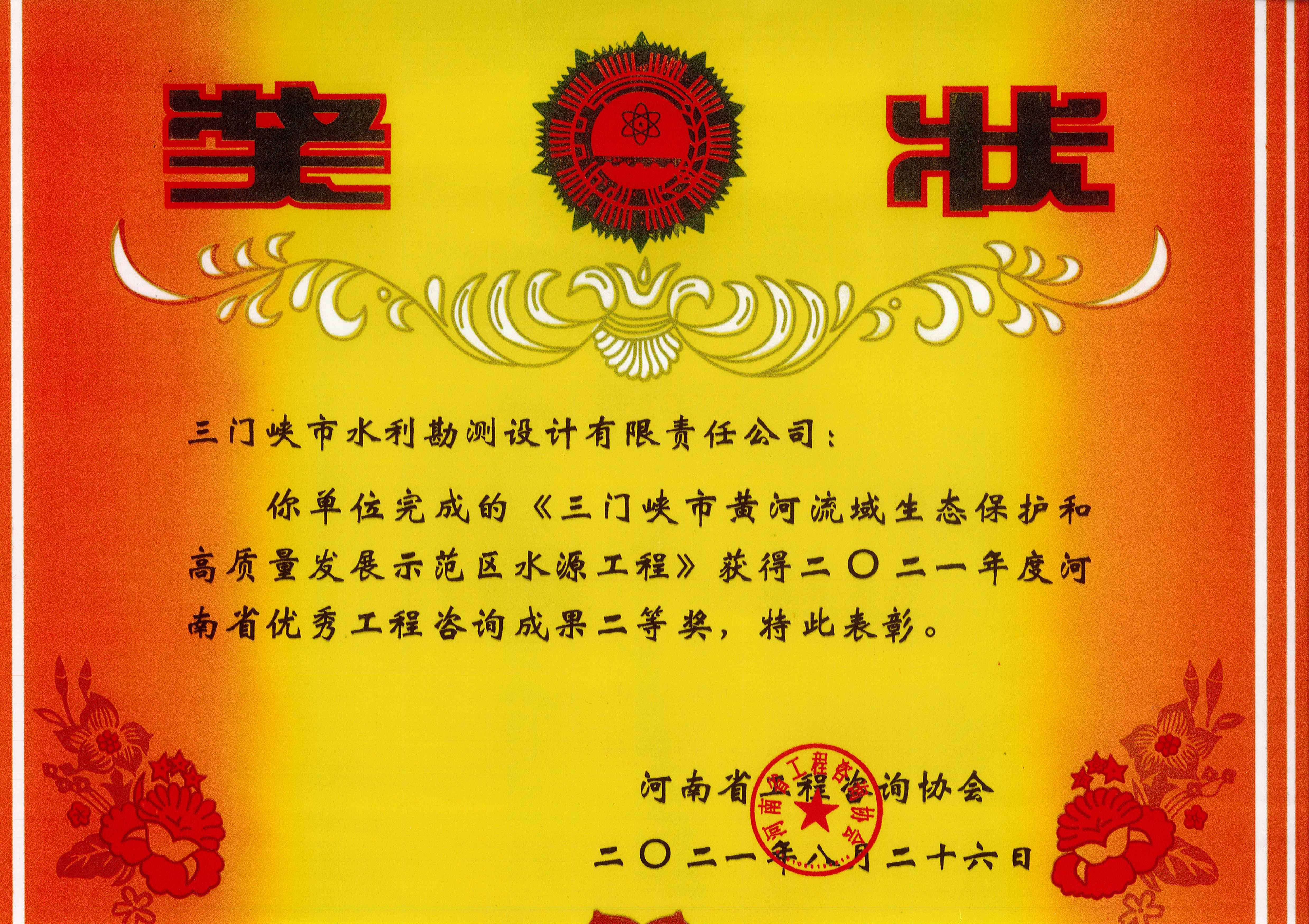 近日,由我公司承擔(dān)完成的《故城縣水資源均衡集約利用規(guī)劃》、《黃河流域平?jīng)鍪谐缧趴h汭河水源涵養(yǎng)及生態(tài)保護(hù)項(xiàng)目可行性研究報(bào)告》、《濟(jì)源城鄉(xiāng)一體化供水面部領(lǐng)區(qū)供水工程項(xiàng)目建議書》和《三門峽市黃河流域生態(tài)保護(hù)和高質(zhì)量發(fā)展示范區(qū)水源工程》獲2021年度河南省優(yōu)秀工程咨詢成果獎(jiǎng)。