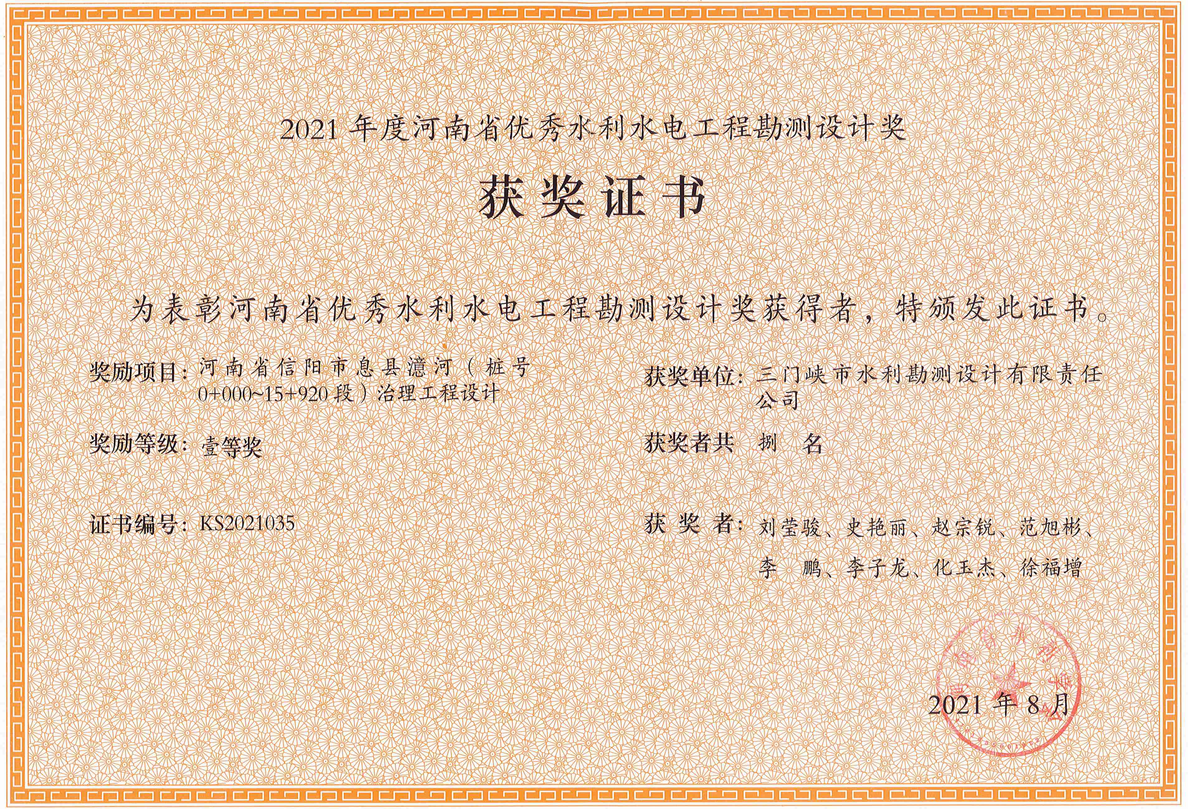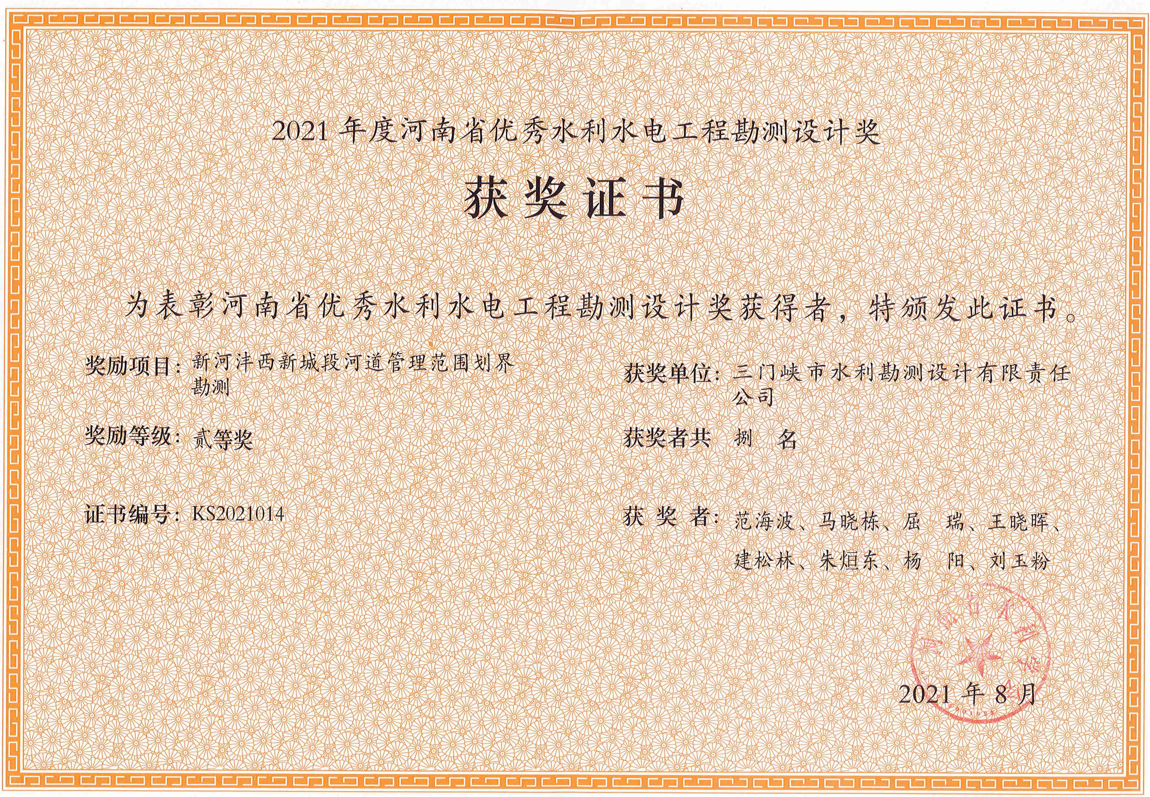 近日,由我公司承擔(dān)完成的五個項目分別獲2021年度河南省優(yōu)秀水利水電工程勘測設(shè)計獎一等獎和二等獎。其中,獲一等獎的項目有《三門峽市天鵝湖防洪改造提升工程可行性研究》、《河南省信陽市息縣澺河(樁號0+00-15+920段)治理工程設(shè)計)》;二等獎的項目有《河南省三門峽市靈寶市農(nóng)業(yè)綜合開發(fā)紅線渠灌區(qū)節(jié)水配套改造工程設(shè)計》、《息縣河湖管理范圍和水利工程管理與保護范圍調(diào)查工程勘測》和《新河灃西新城段河道管理范圍劃界勘測》。