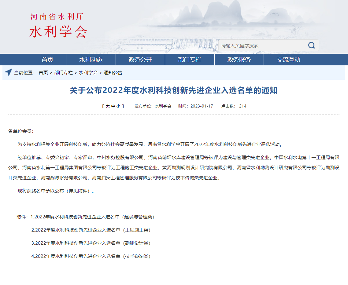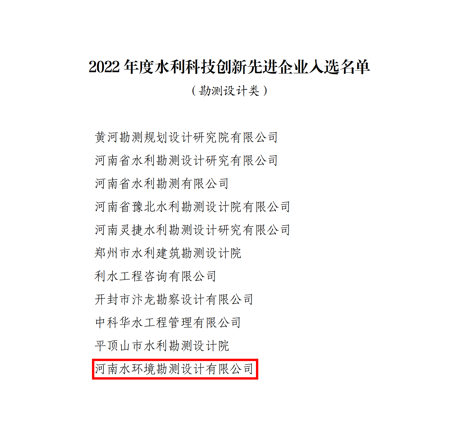 河南省水利學(xué)會組織開展了2022年度水利科技創(chuàng)新先進(jìn)企業(yè)評選活動,經(jīng)單位推薦、專委會初審、專家評審,我公司被評為勘測設(shè)計類先進(jìn)企業(yè)。