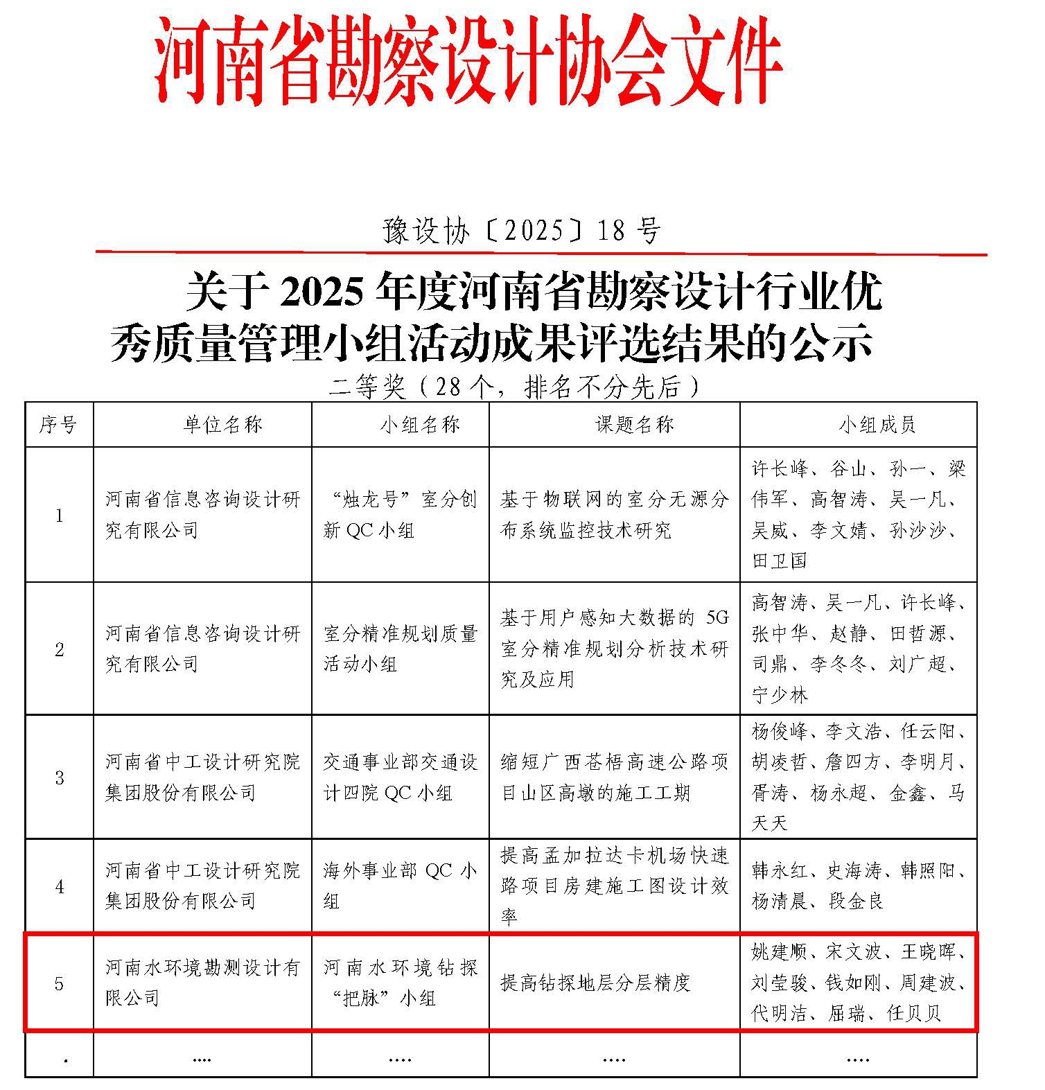 近日,由河南省勘察設(shè)計(jì)協(xié)會(huì)組織的2025年度河南省勘察設(shè)計(jì)行業(yè)優(yōu)秀質(zhì)量管理(QC)小組活動(dòng)評(píng)選結(jié)果揭曉。經(jīng)過前期精心策劃、扎實(shí)實(shí)施和現(xiàn)場精彩匯報(bào),我公司選送的兩個(gè)質(zhì)量管理小組在激烈競爭中脫穎而出,斬獲佳績!