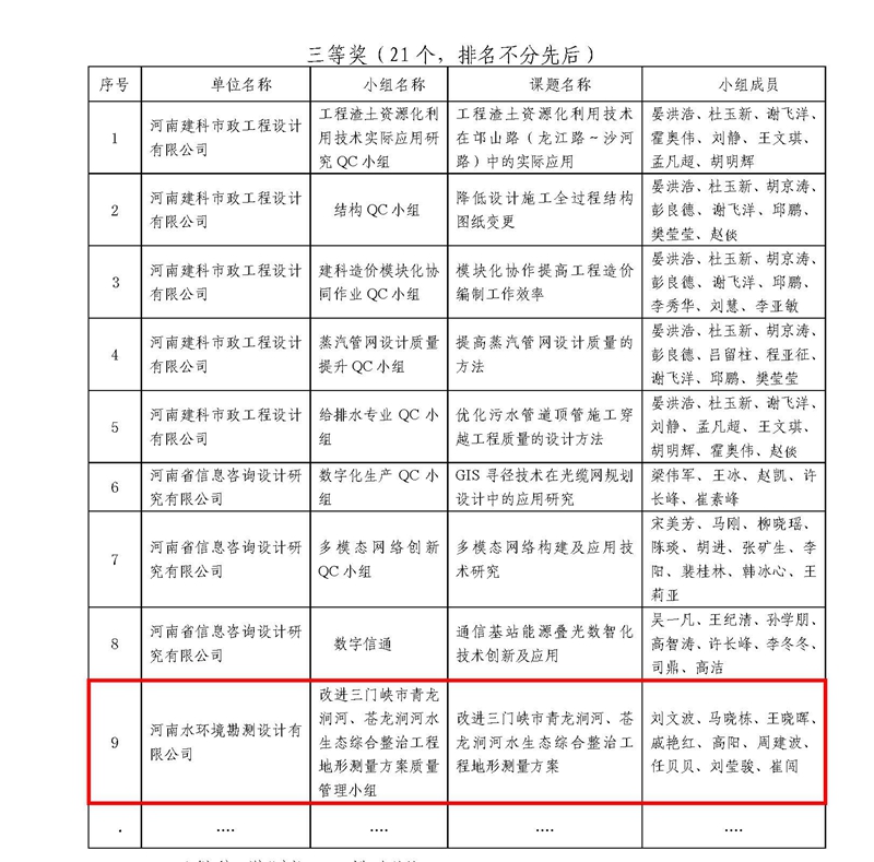 其中,“河南水環(huán)境鉆探‘把脈’小組”研究課題“提高鉆探地層分層精度”憑借創(chuàng)新性的技術(shù)和高效的質(zhì)量管理實(shí)踐,榮獲二等獎(jiǎng);“改進(jìn)三門峽市青龍澗河、蒼龍澗河水生態(tài)綜合整治工程地形測量方案質(zhì)量管理小組”以優(yōu)化工程方案、提升測量精度為核心,榮獲三等獎(jiǎng)。