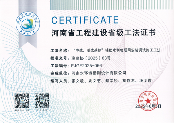 近日河南省建筑業(yè)協會發(fā)布《關于公布2025年度第一批河南省省級工法的通知》(豫建協【2025】63號),公司申報的河南省工程建設省級工法——“‘中試、測試基地’輔助水利物聯網安裝調試施工工法”獲批!這是我司首次獲得省級工法證書。