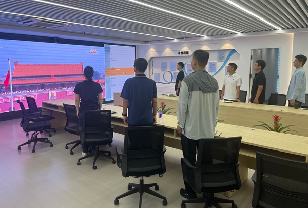 當(dāng)國旗在屏幕上冉冉升起,全體員工自發(fā)起立,跟隨直播齊唱國歌,神情莊嚴(yán)肅穆,充滿了對革命先烈的深切緬懷和對祖國的無限熱愛。