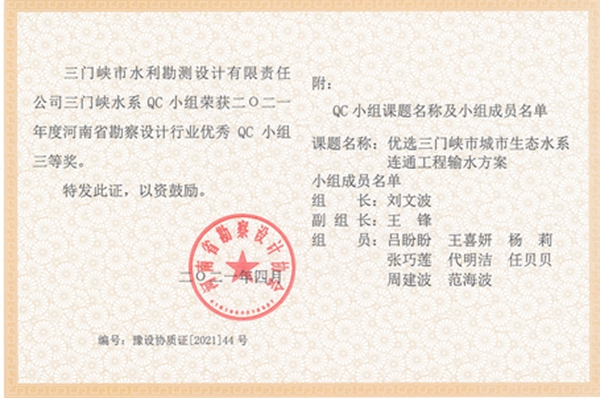 三門峽市城市生態(tài)水系連通工程輸水方案榮獲2021年度河南省勘察設(shè)計(jì)行業(yè)優(yōu)秀QC小組三等獎(jiǎng)
